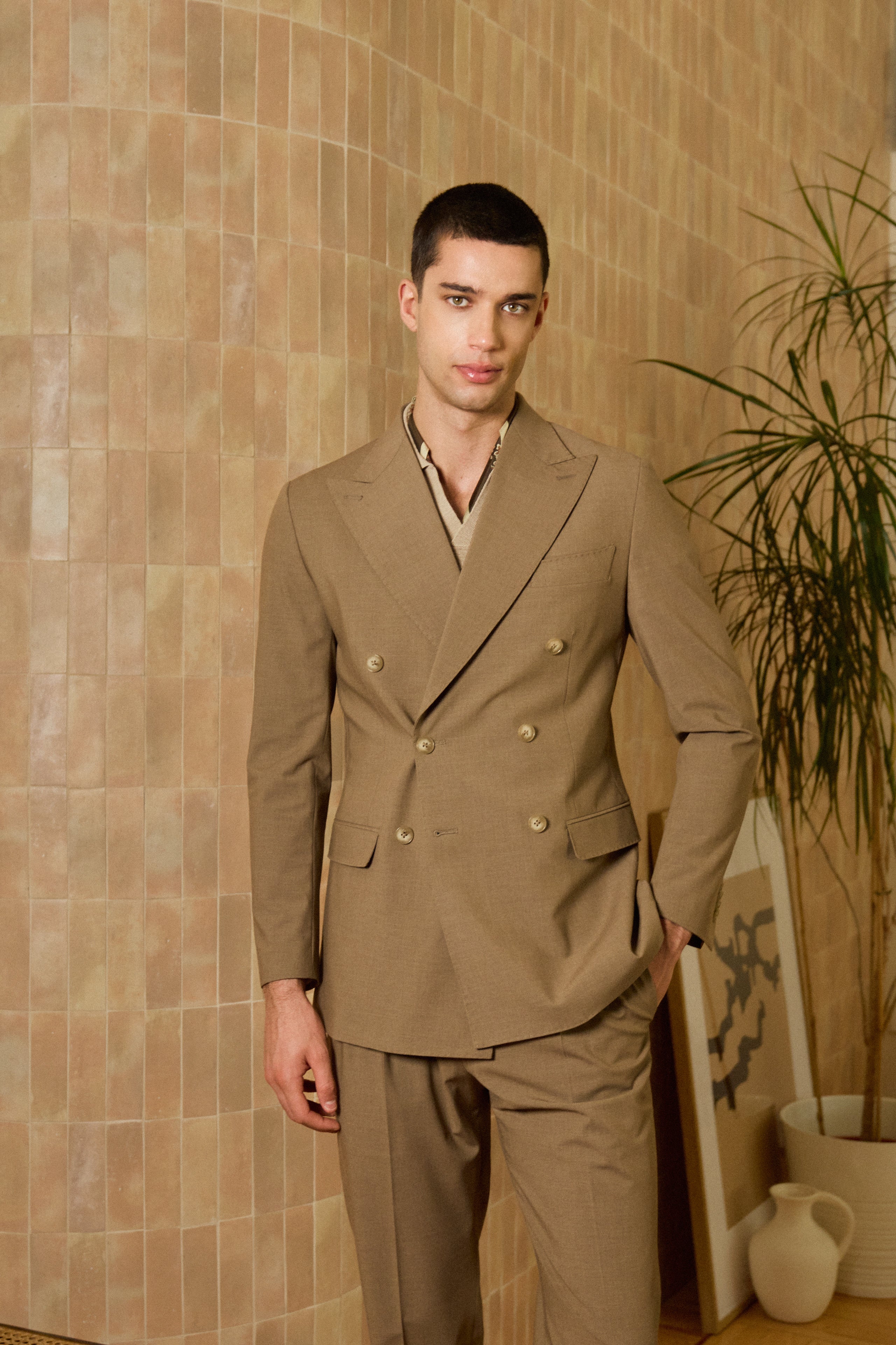 Esta primavera, la propuesta sigue apostando fuerte por la americana cruzada de solapa ancha como gran icono. La acompañan pantalones de tiro alto pero de silueta mucho más recta y ancha, más confortable también y válida para cualquier estilo de hombre. La riqueza de tejidos naturales como el lino y las mezclas de algodón, es clave también a la hora de conseguir ese efecto relaxed que transmite en sí todo el conjunto de la colección.