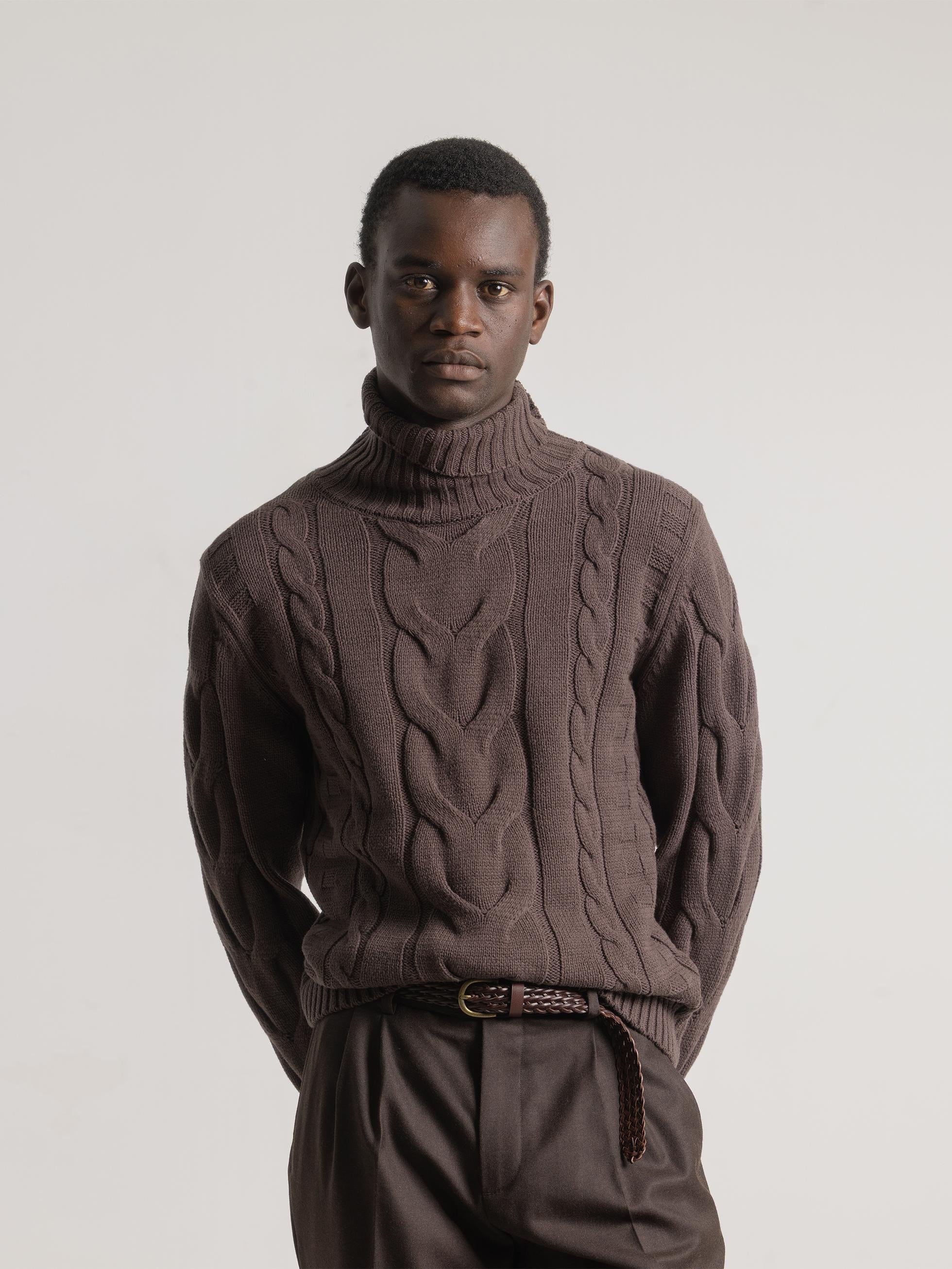 CHOCOLATE HIGH NECK CABLE KNIT SWEATER
