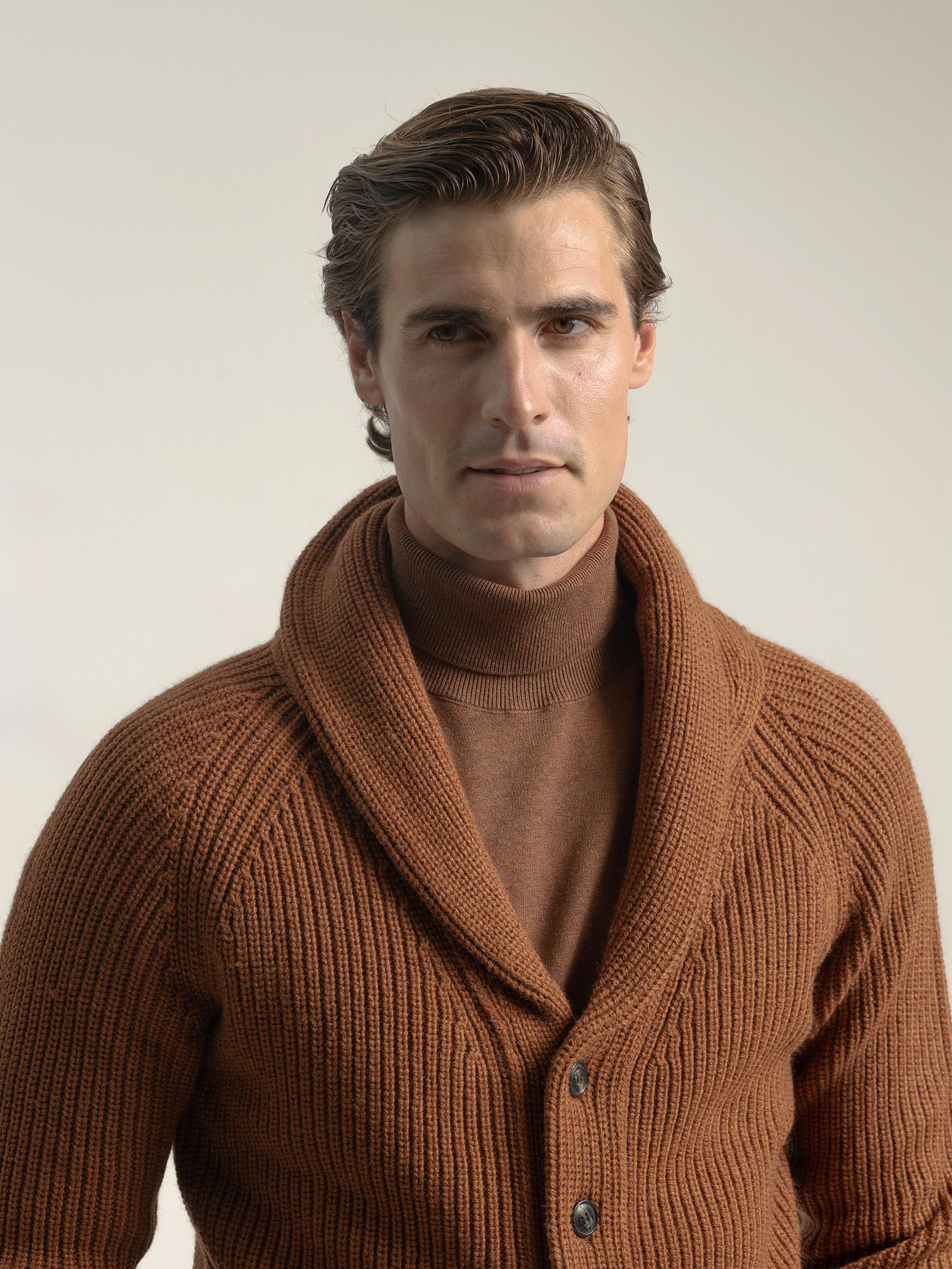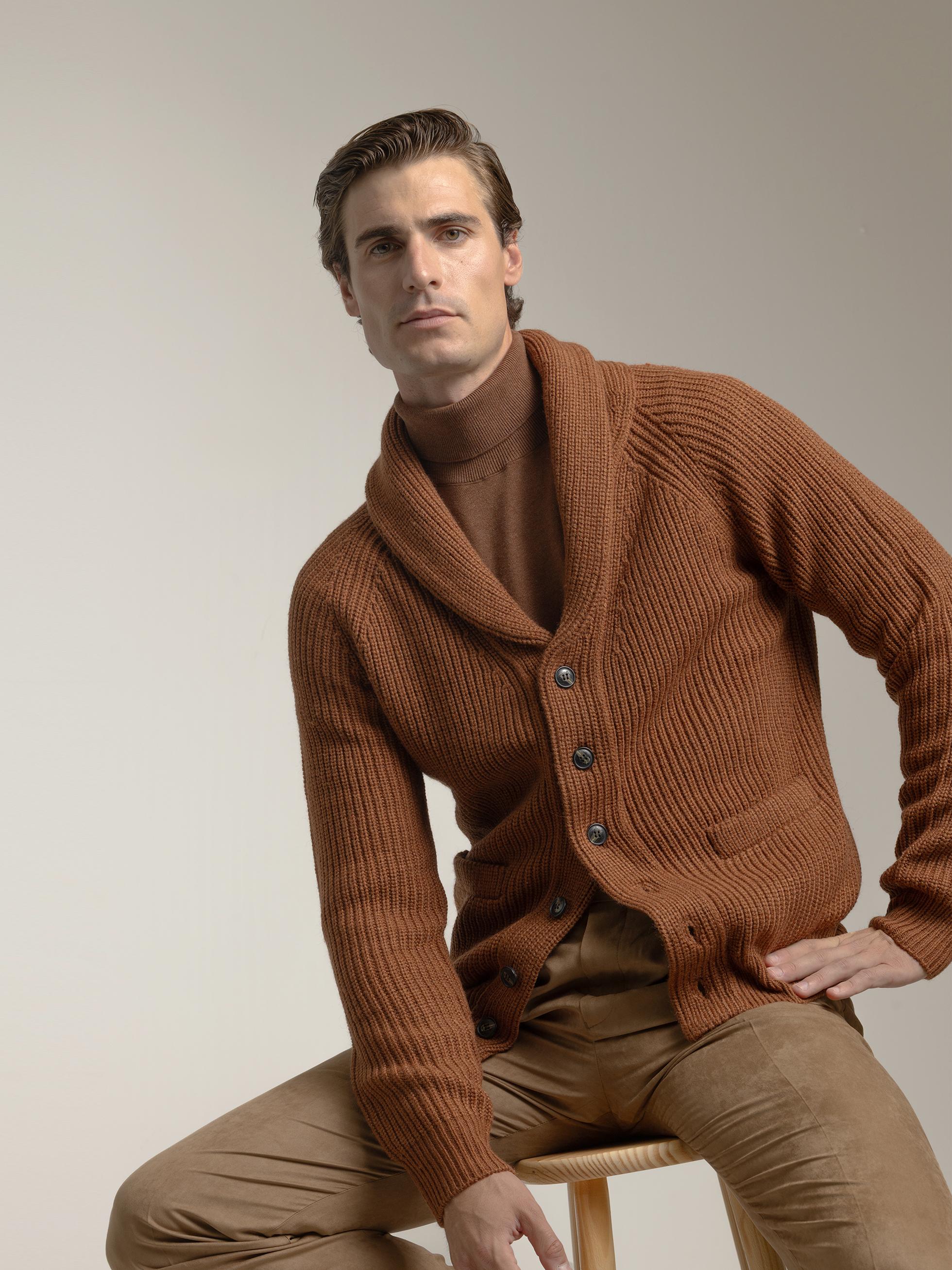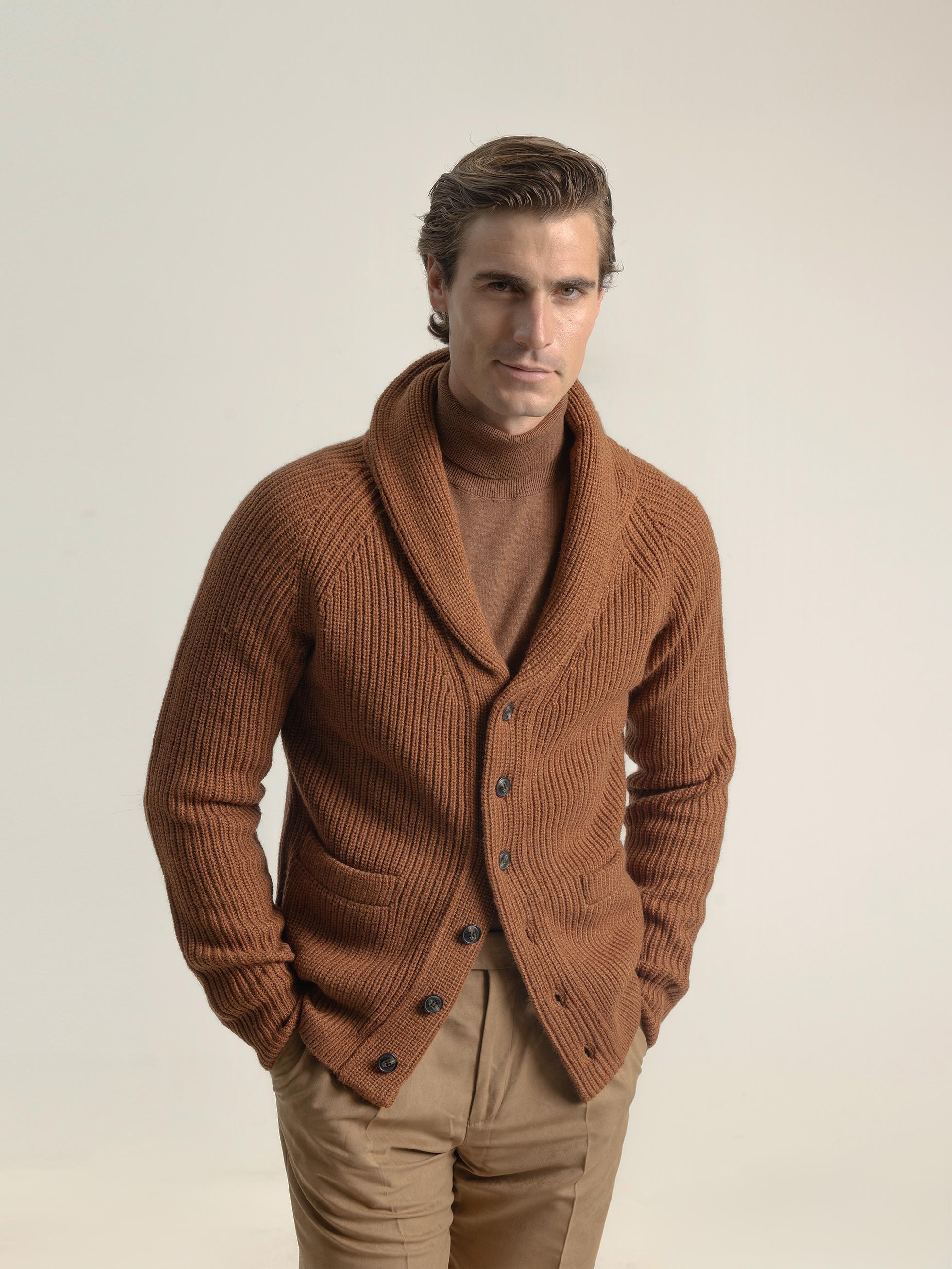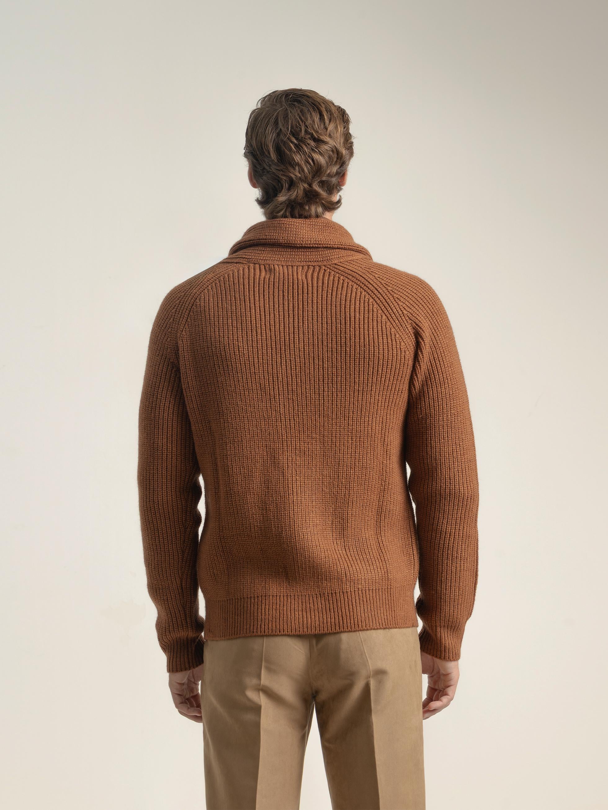 TERRACOTTA SHAWL COLLAR RIBBED CARDIGAN