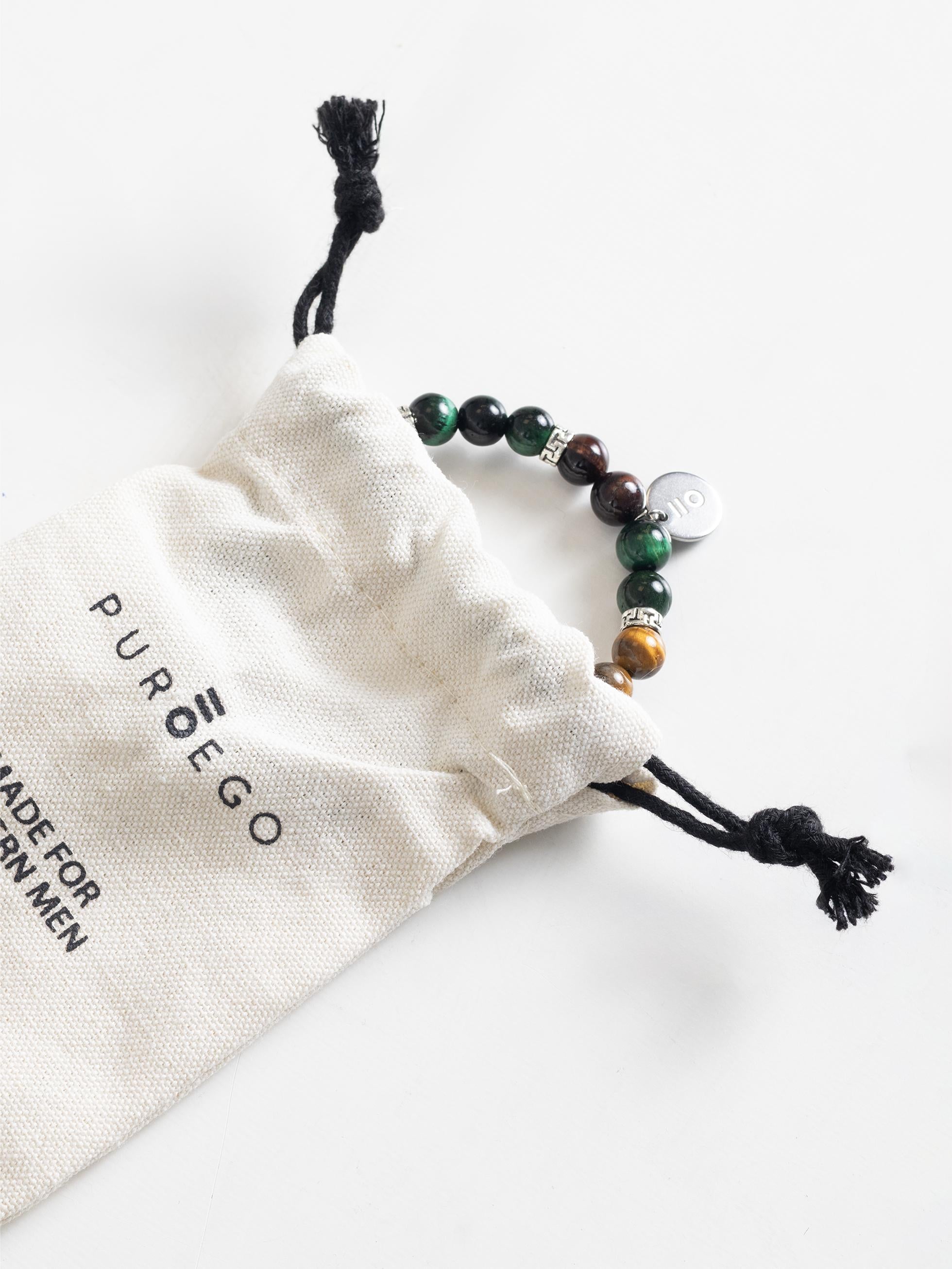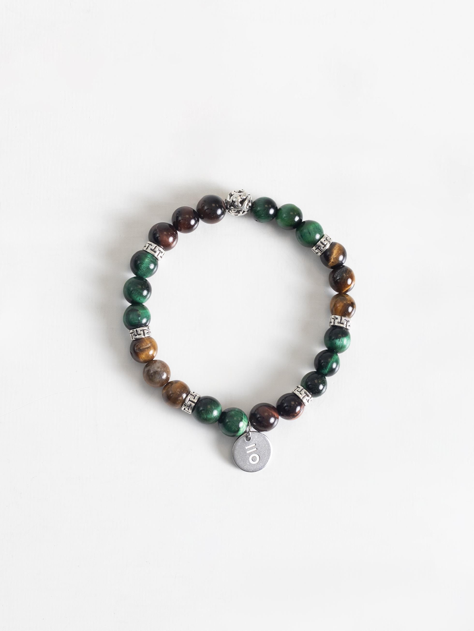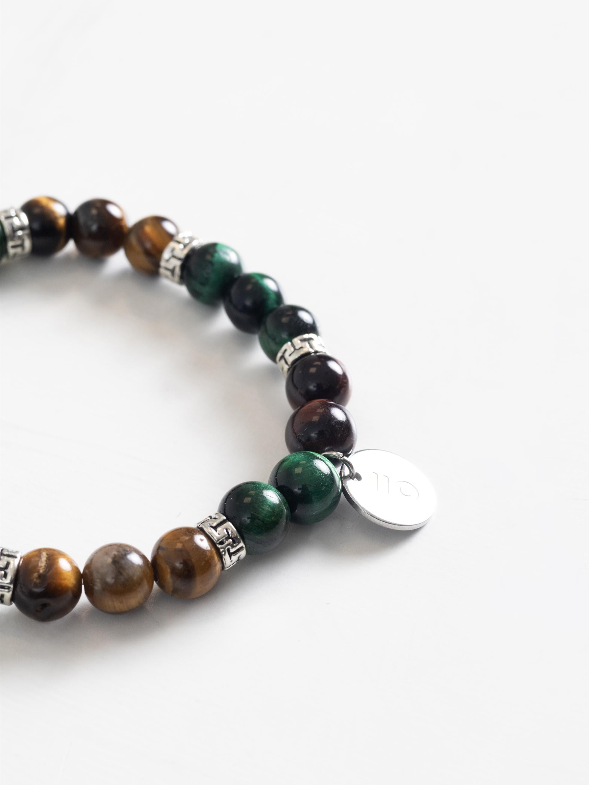 - Stone bracelet and metal detail.