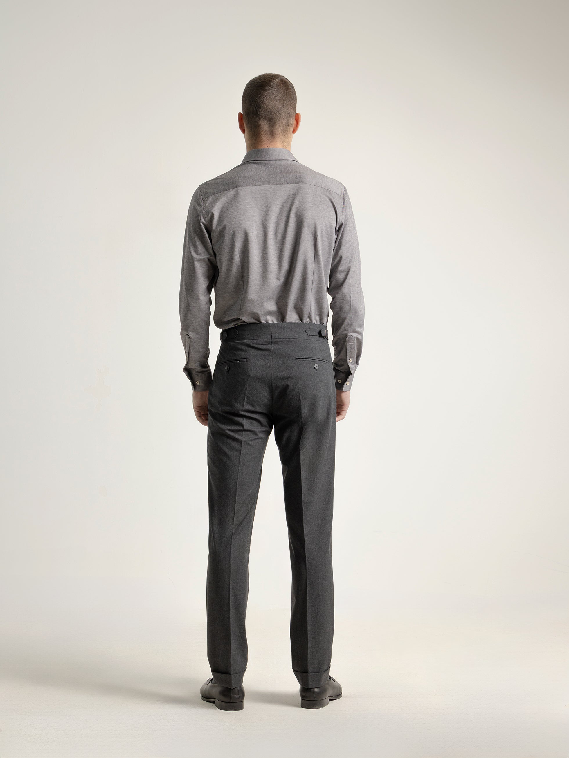 - 4 cm waistband with slightly offset button closure and side buckles.